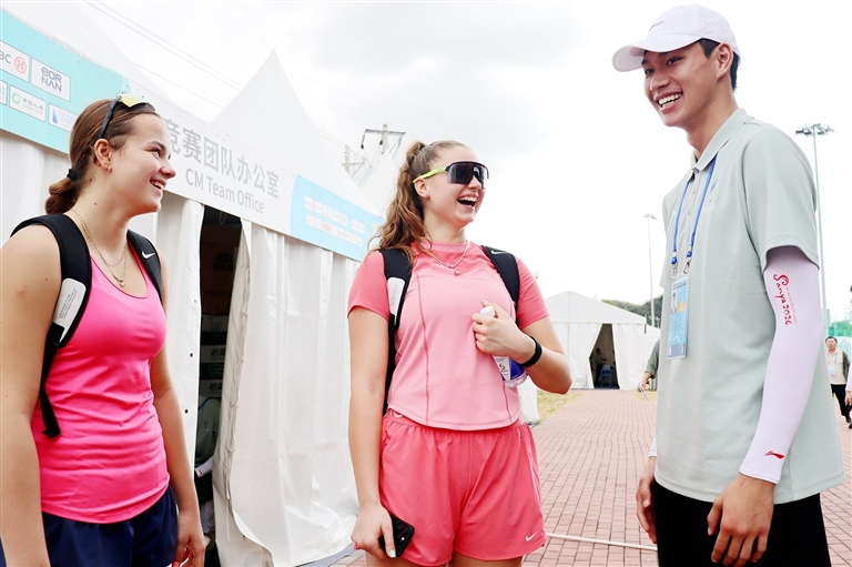 A volunteer helps foreign athletes during the test event for the 6th Asian Beach Games Sanya 2026. [Photo/Sanya Daily]