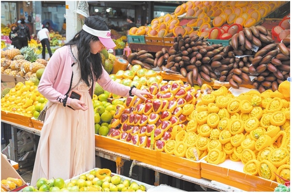 In the fruit section of a shopping mall in Sanya, a dazzling array of tropical fruits are neatly arranged on the shelves, attracting customers to stop and choose. [Photo/Sanya Daily]