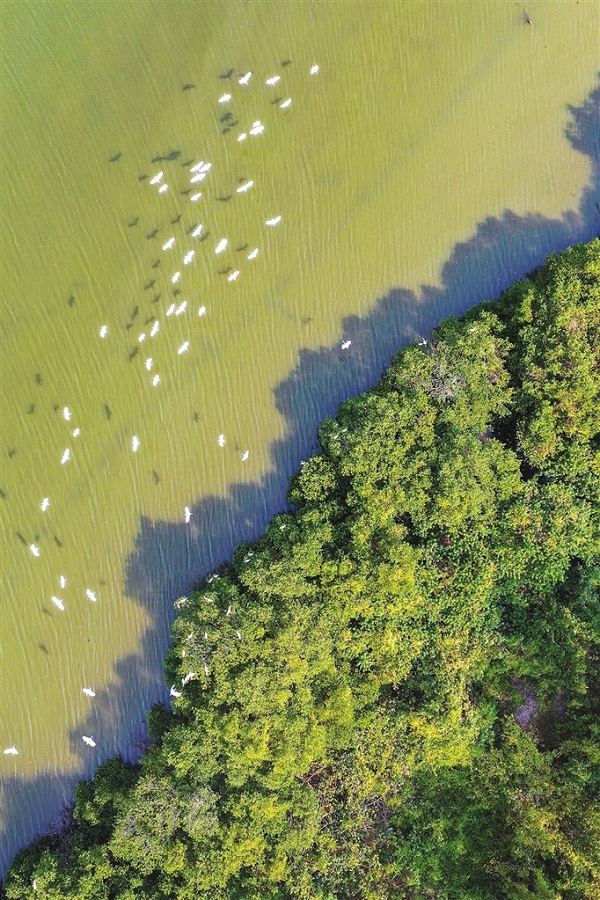 Over the mangrove forests of the Sanya River, flocks of egrets soar and circle gracefully on the wind, their agile figures adding a touch of poetry to the riverside scenery. [Photo/Sanya Daily]