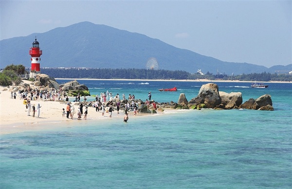 At the Wuzhizhou Island scenic area in Sanya, tourists play in the water and take photos along the picturesque coastline. [Photo/Sanya Daily]