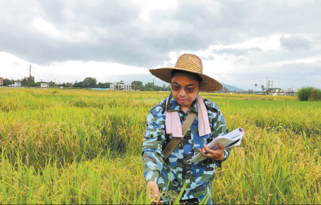 Zhang Guangheng checks the performance of hybrid rice seedlings in Hainan province. CHINA DAILY