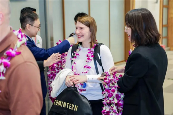 The staff at Sanya Phoenix International Airport present flower garlands to passengers. [Photo/Sanya Daily]