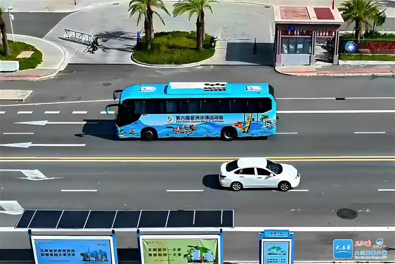 A bus decorated with 6th Asian Beach Games Sanya 2026 themes cruises through the street in Sanya. [Photo/Sanya Daily]