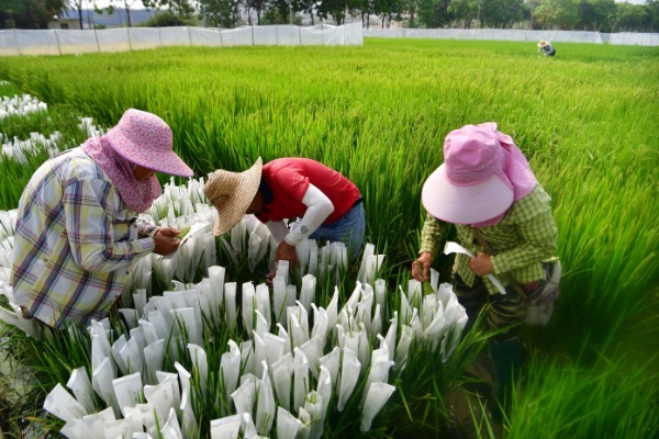 Technicians are busy carrying out artificial cross pollination of small varieties in a "sea of flowers".[Photo by Guo Liliang/For China Daily]