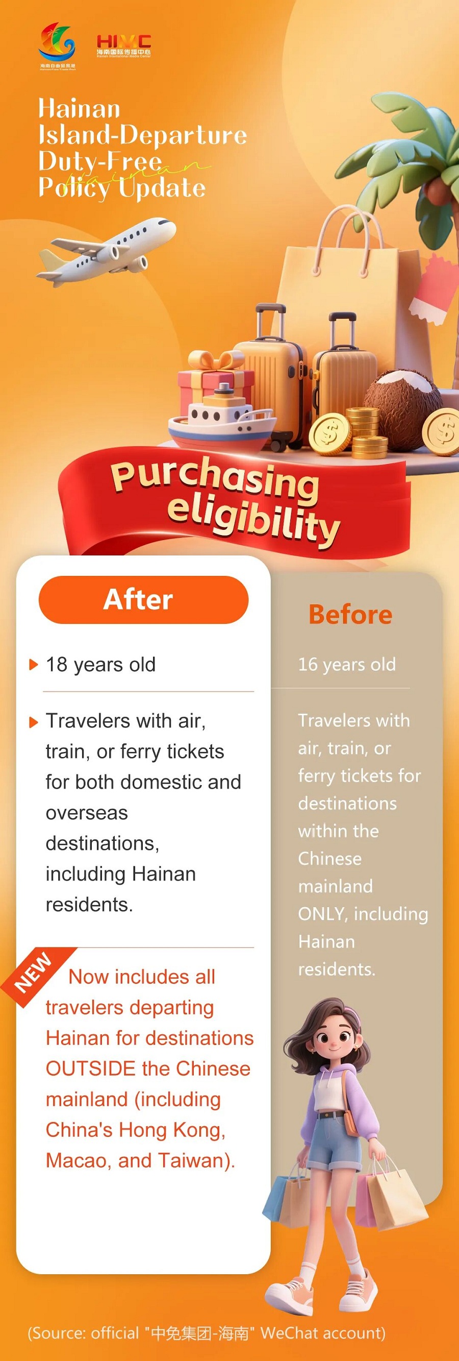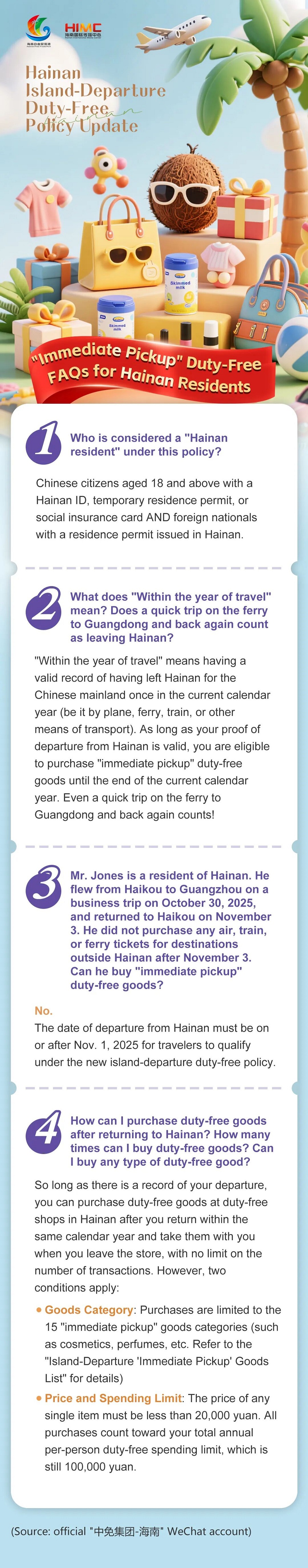 Starting Nov 1, Hainan's island-departure duty-free shopping policy will cover more travelers, include more categories, and allow Hainan residents (including expats) who have traveled outside Hainan to buy duty-free goods for immediate pickup for up to one year after their trip.